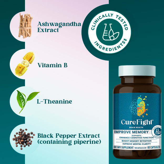 CureFight aims to support cognitive functions such as memory and focus. Some studies suggest that ingredients like Ashwagandha Extract and Vitamin B may have potential benefits for brain health, but effects vary from person to person. Large-scale independent clinical trials for dietary supplements are limited, so results may not be immediate or universal. A healthy diet, exercise, and sleep may enhance its effects.